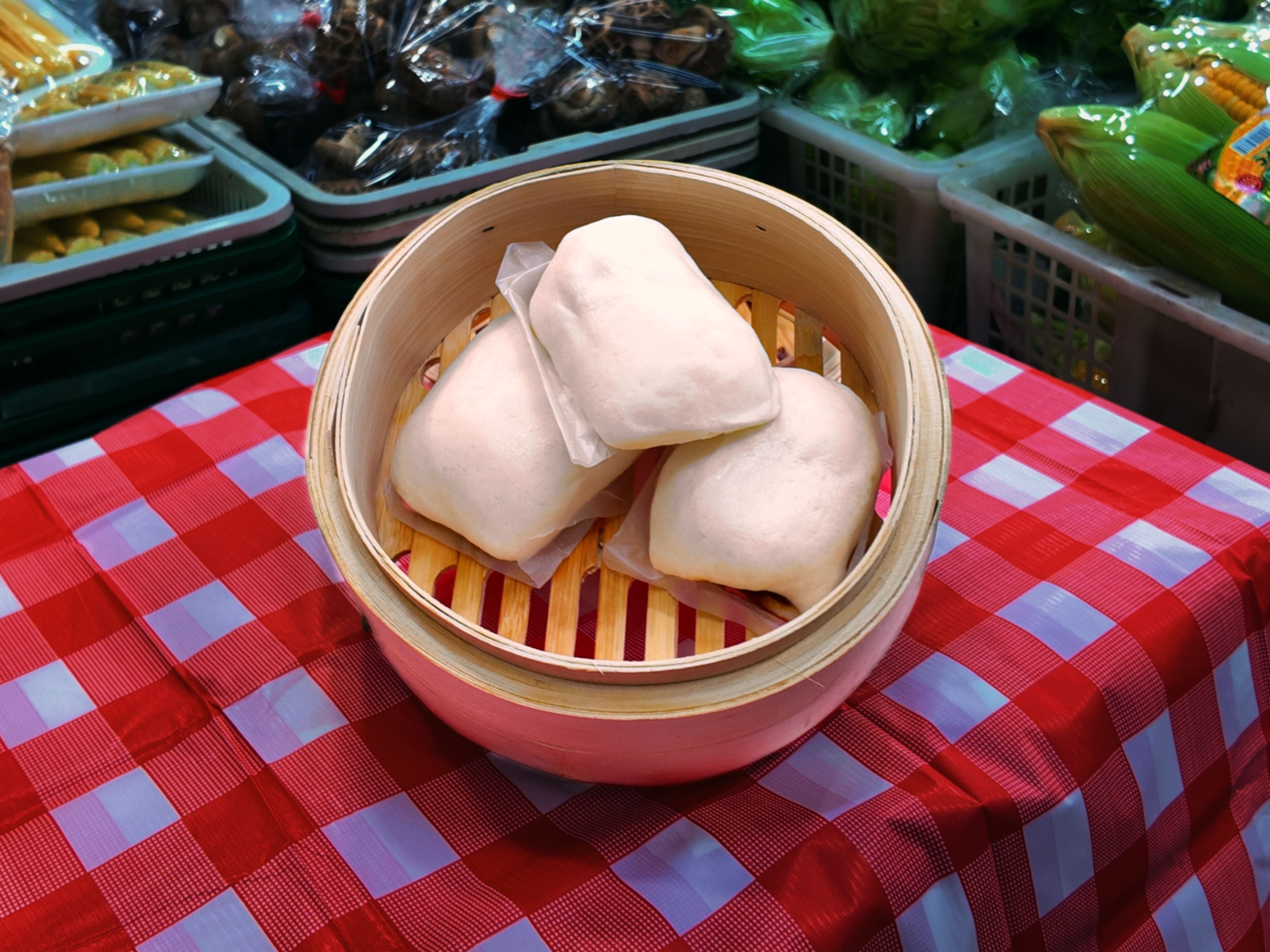 (Pasar Hack) Before steaming, sprinkle the Baos with water to moisten them.
